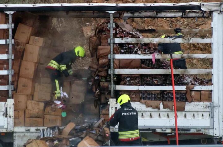 Bolu geçişinde züccaciye eseri yüklü bir kamyonun dorsesinde çıkan yangın, itfaiye grupları tarafından denetim...