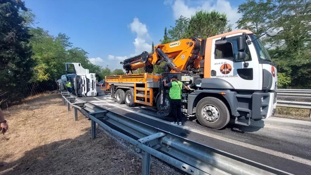 Anadolu Otoyolu Ankara istikameti Akyazı gişeleri yol ayrımında Kerem G. idaresindeki 41 AVE 972 plakalı konteyner yüklü tır, şoförünün direksiyon hakimiyetini kaybetmesi sonucu devrildi.