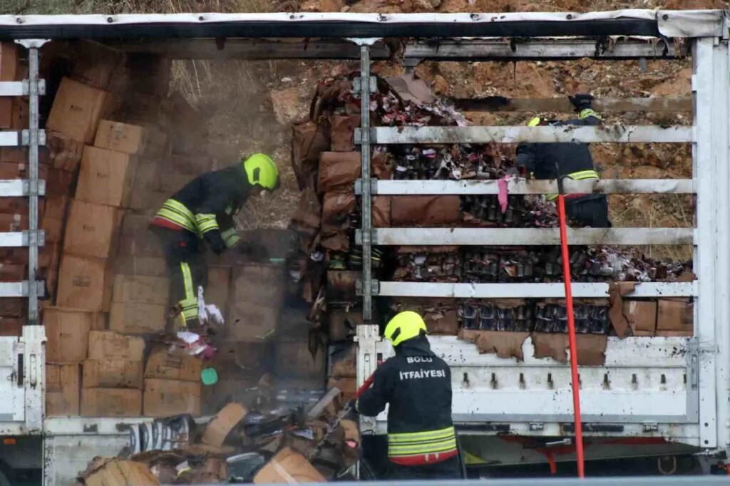 TEM Otoyolu’nun Bolu geçişinde züccaciye eseri yüklü kamyonun dorsesinde çıkan yangın takımlarca söndürüldü.
